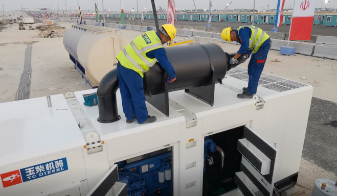 为更好服务这场世界顶级体育赛事,结合卡塔尔炎热干燥、多风沙的特殊地理环境,玉柴对此批配套动力进行了针对性优化,包括使用了适应沙尘环境的空气滤清器等,以确保发电机组在当地气候条件下仍能稳定、高效输出电力。目前,在美丽的卡塔尔球迷营地,153台玉柴发电机组正在高效可靠地运行。